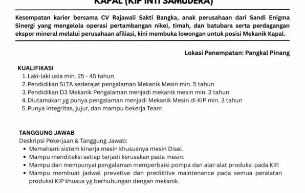 untuk posisi MEKANIK di Kapal isap INTI SAMUDERA