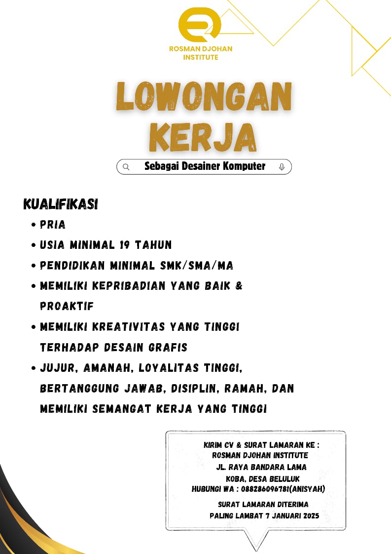 Rosman Djohan Institut membuka kesempatan kerja untuk posisi Desainer Komputer.