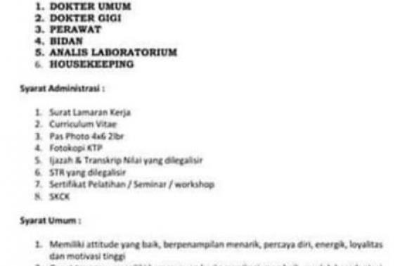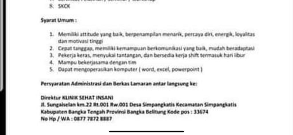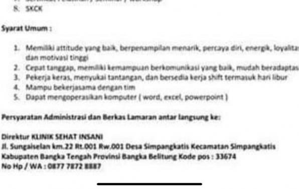 dokter Umum,dokter gigi,perawat,bidan,analis Lab & houseekeeping @klinik sehat insani-Bangka Tengah.