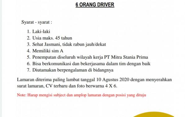 Syarat²: Laki², usia maksimal 45 tahun, sehat jasmani-tidak rabun jauh/dekat,memiliki SIM A, penempatan diseluruh wilayah kerja PT.Mitra Stania, dapat berkomunikasi dan bekerjasaa dalam tim, diutamakan berpengalaman di bidang driver.