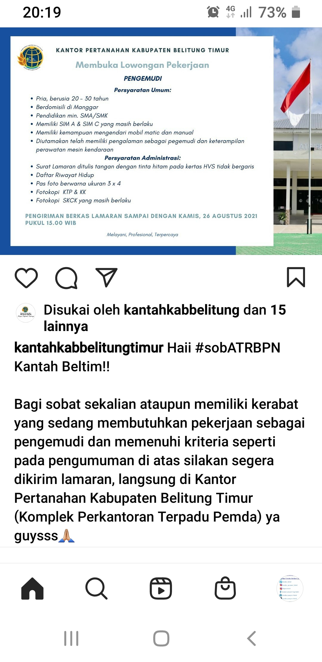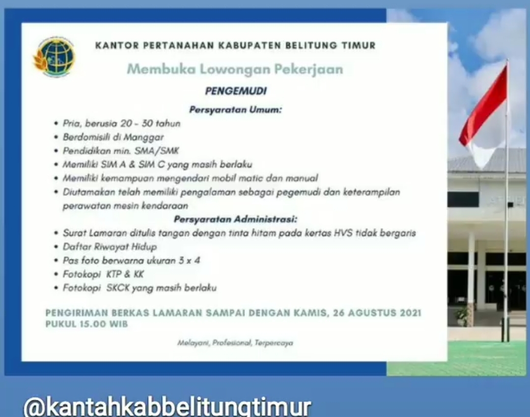 info Loker DRIVER @kantor Pertanahan Beltim