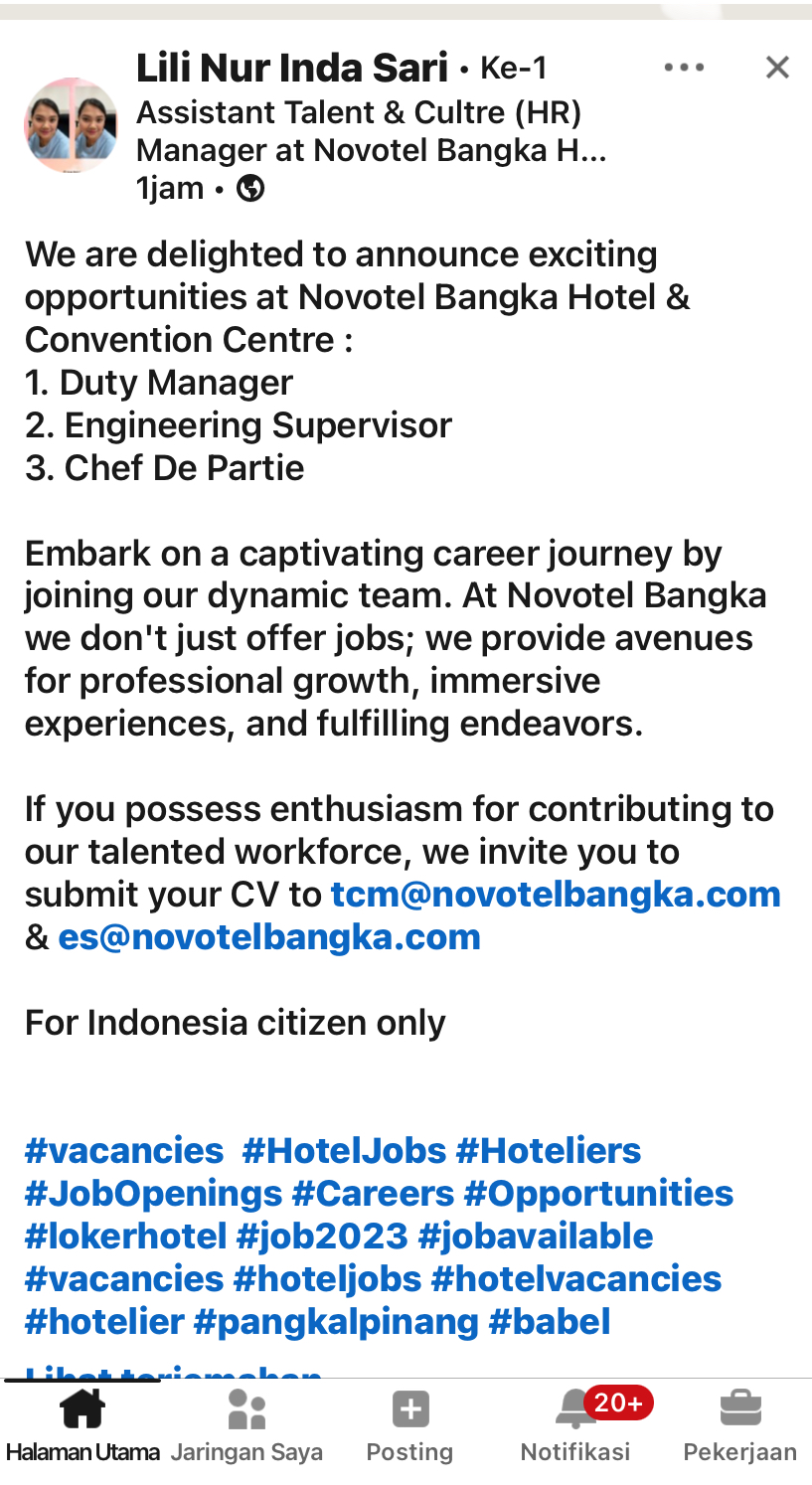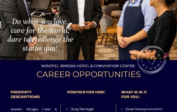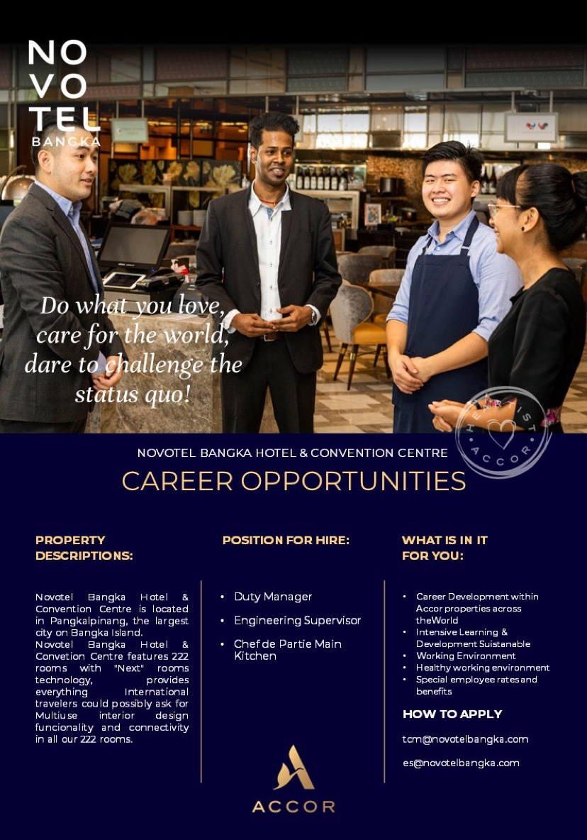 info Loker Duty Manager,Engineering Supervisor & Chef de Parties-Novotel Bangka Hotel
