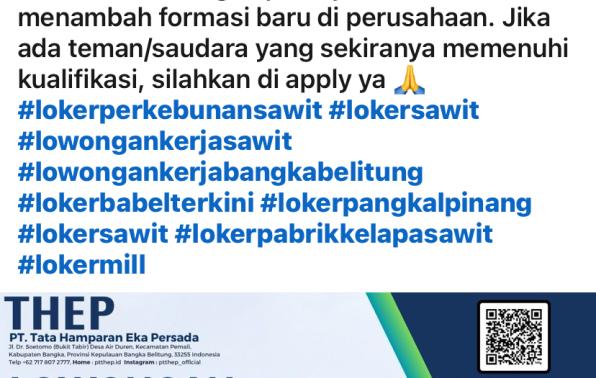 PT Tata Hamparan Eka Persada/THEP membuka kesempataan kerja untuk posisi Engineering Staff penempatan Puding Besar.