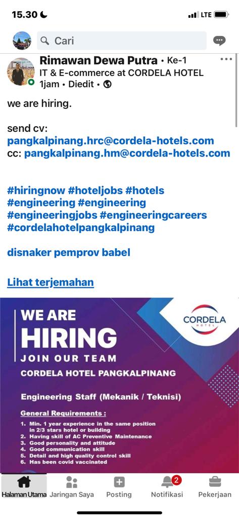 info Loker Engineering Staff(mekanik/teknisi)-Cordela Hotel-Pangkalpinang