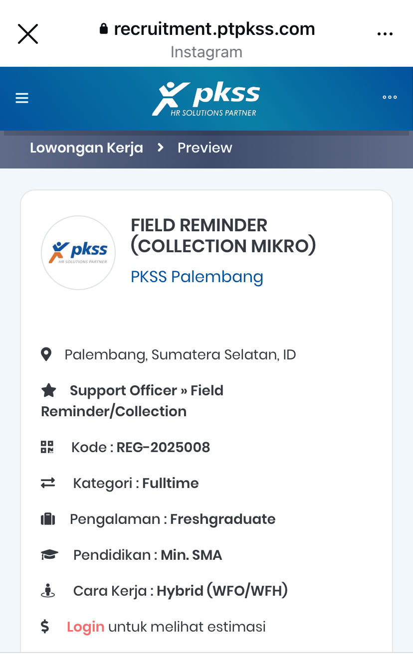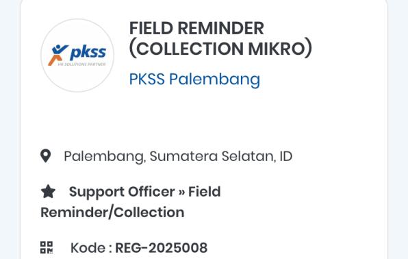 Pendaftaran di Link: https://recruitment.ptpkss.com/id/co/pkss-palembang/reg-2025008-field-reminder-collection-mikro