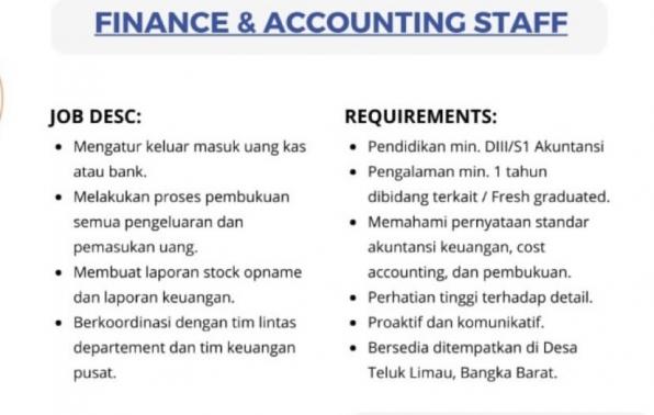 PT Suri Tani Pemuka membuka kesempatan kerja untuk posisi FINANCE & ACCOUNTING STAFF penempatan di Kabupaten Bangka Barat di Desa Teluk Limau.