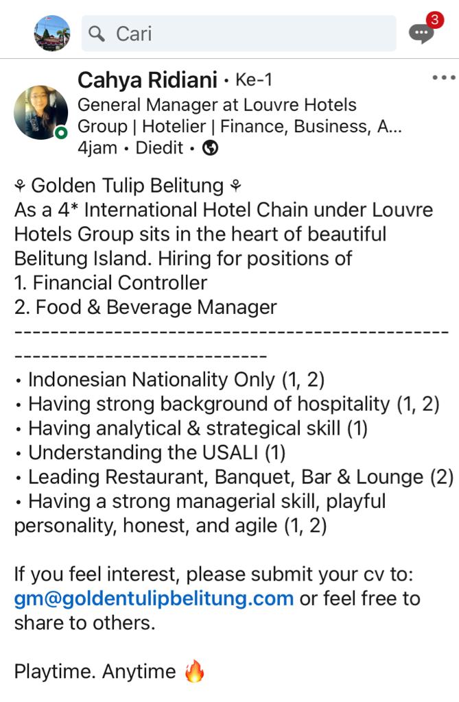 FINANCIAL CONTROLLER  & FOOD-BEVERAGE Manager-Golden Tulip Belitung