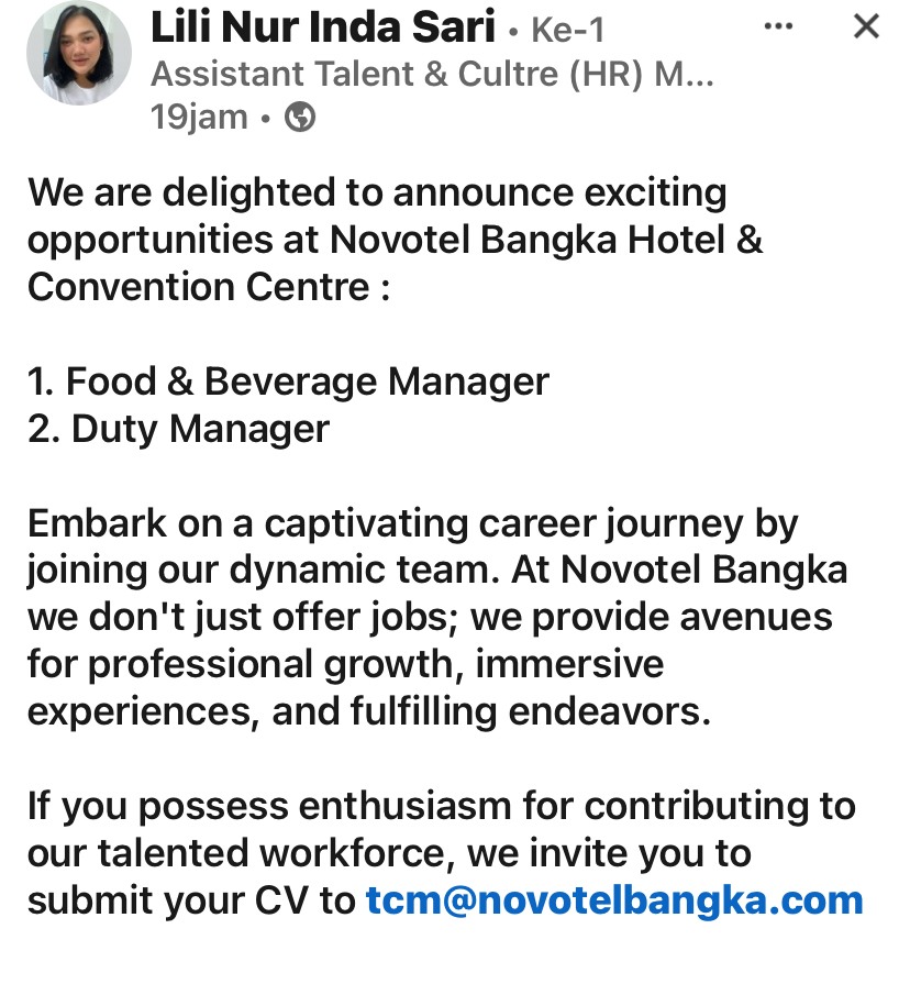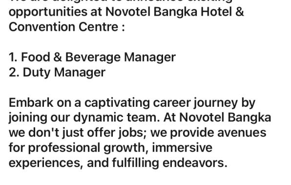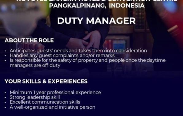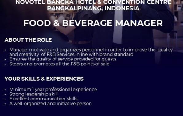 info Loker Food/Beverage Manager & Duty Manager-Novotel Bangka Hotel