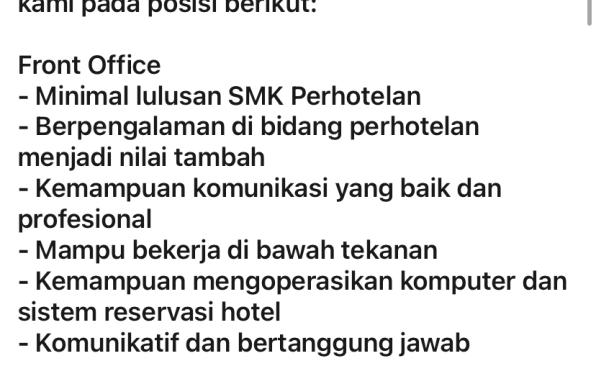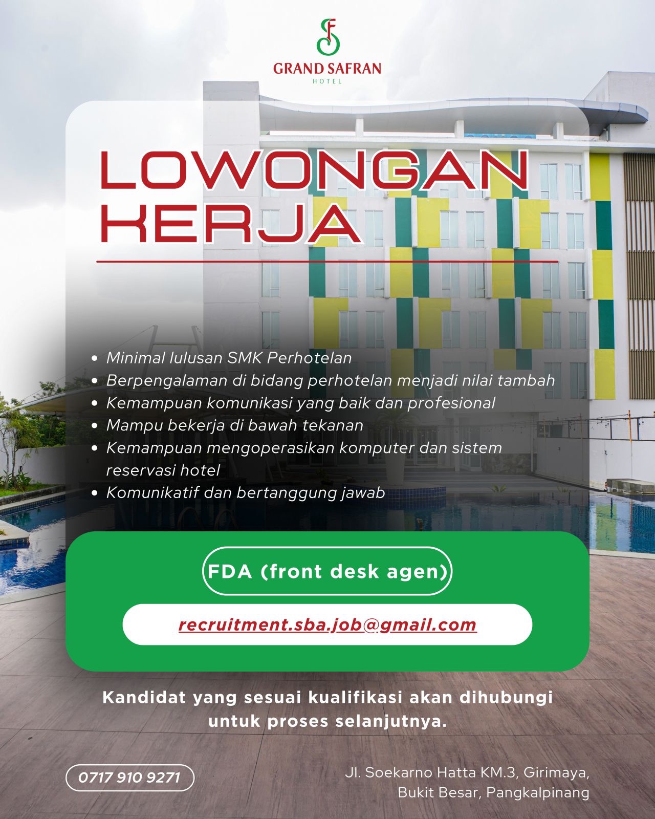Grand Safran Hotel Pangkalpinang membuka kesempatan kerja untuk posisi Front Office.