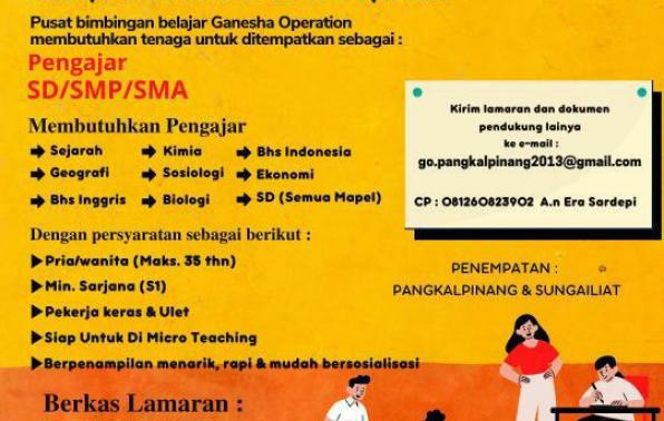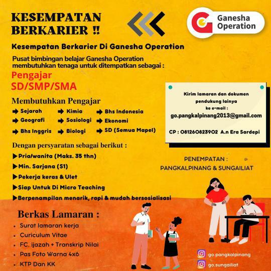 info Loker Guru Sejarah,Geografi,Bahasa Inggris,Kimir,Sosiologi,Biologi,Bahasa Indonesia,Ekonomi-Ganesa Operation