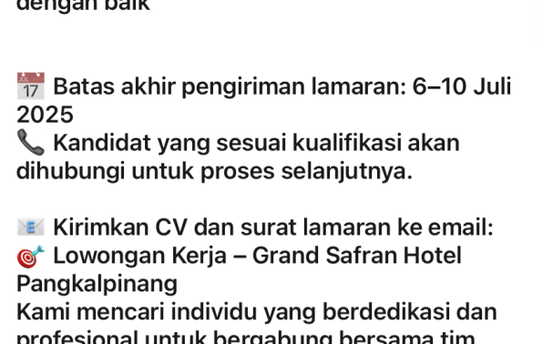 Grand Safran Hotel Pangkalpinang membuka kesempatan kerja untuk posisi:
