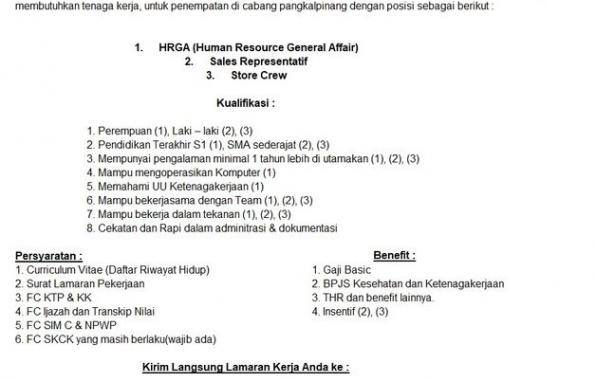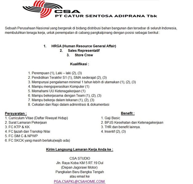 Human Resource General Affair/HRGA,Sales Representative & Store Crew-PT Catur SEntosa Adiprana-Pangkalanbaru-Bangka Tengah