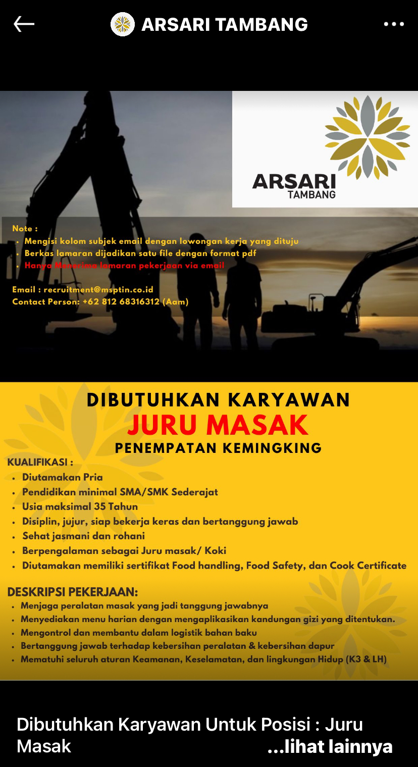 PT MITRA STANIA membutuhkan personil JURU MASAK penempatan Kemingking-Bangka Tengah