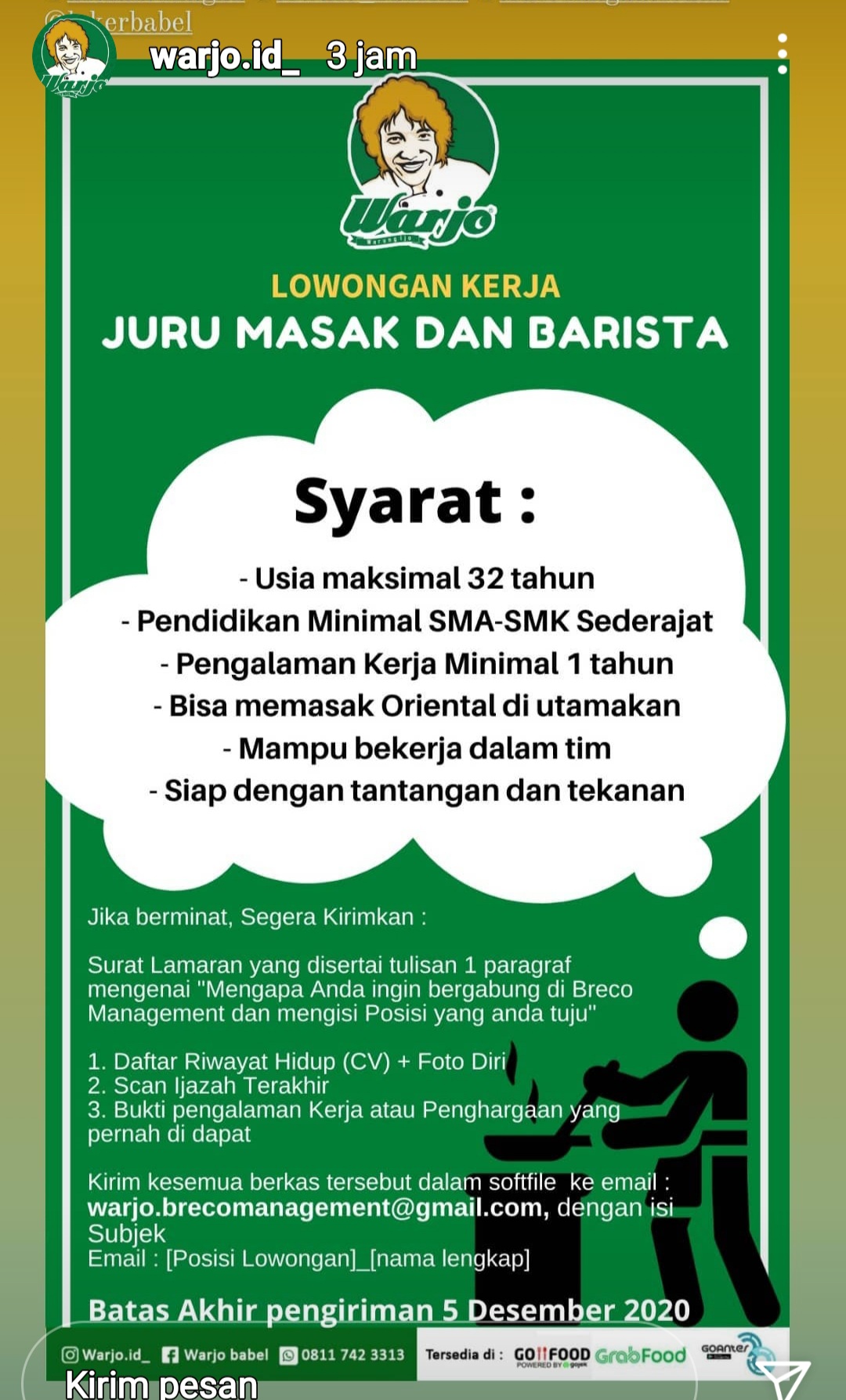 Juru Masak & Barista-Restoran Warjo @Pangkalpinang.