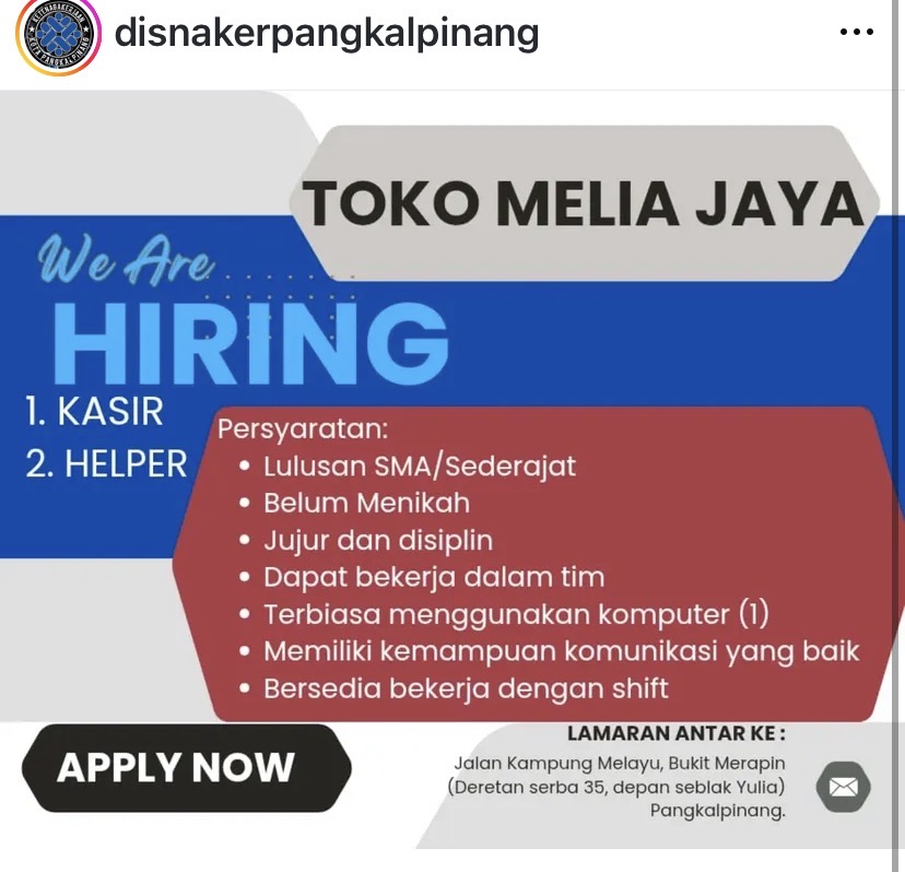 info Loker kasir & Helper-Toko Melia Jaya-Pangkalpinang
