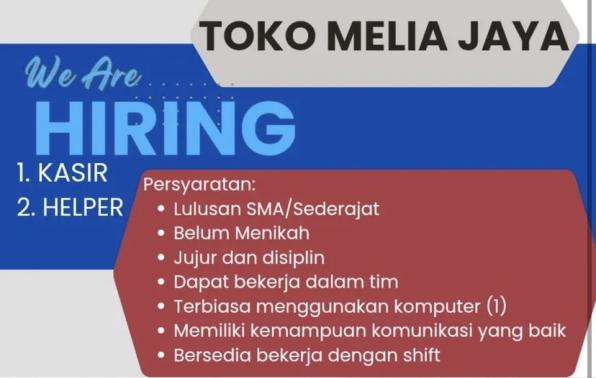 Toko MELIA JAYA bergerak di bidang Retail membuka kesempatan kerja untuk posisi: