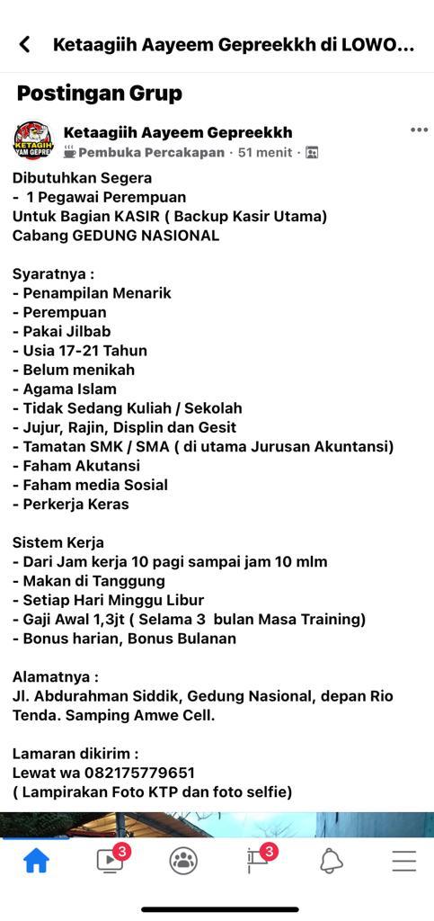 Membutuhkan pegawai KASIR @Pangkalpinang 1(satu) personil.