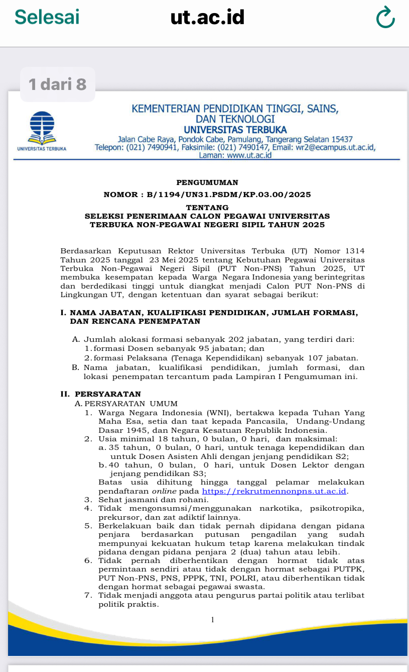 Pengumuman Resmi; https://www.ut.ac.id/wp-content/uploads/2025/05/Pengumuman-Seleksi-Calon-PUT-Non-PNS-2025.pdf
