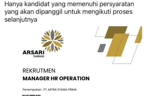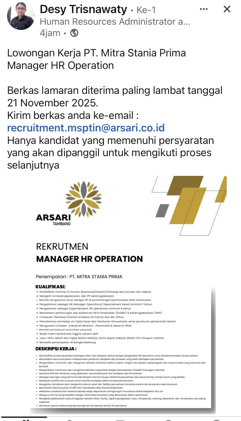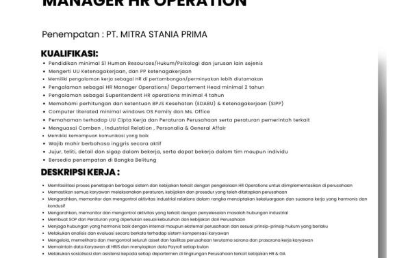 PT MITRA STANIA PRIMA berlokasi di Bangka membuka kesempatan kerja untuk posisi Manager HR Operational.