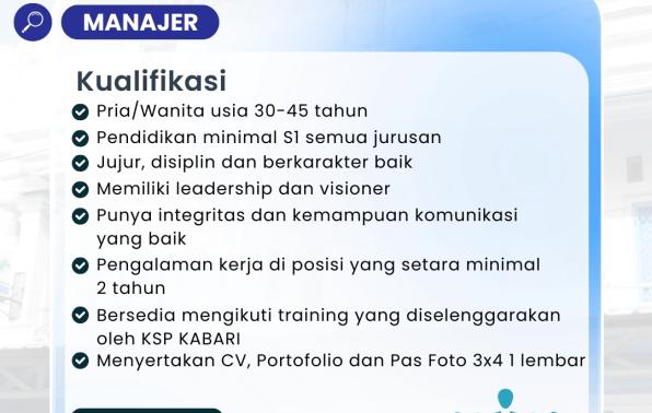 KSP KABARI bergerak di bidang koperasi simpan pinjam) berlokasi di PangkalpinangĀ membuka kesempatan kerja untuk posisi MANAJER.
