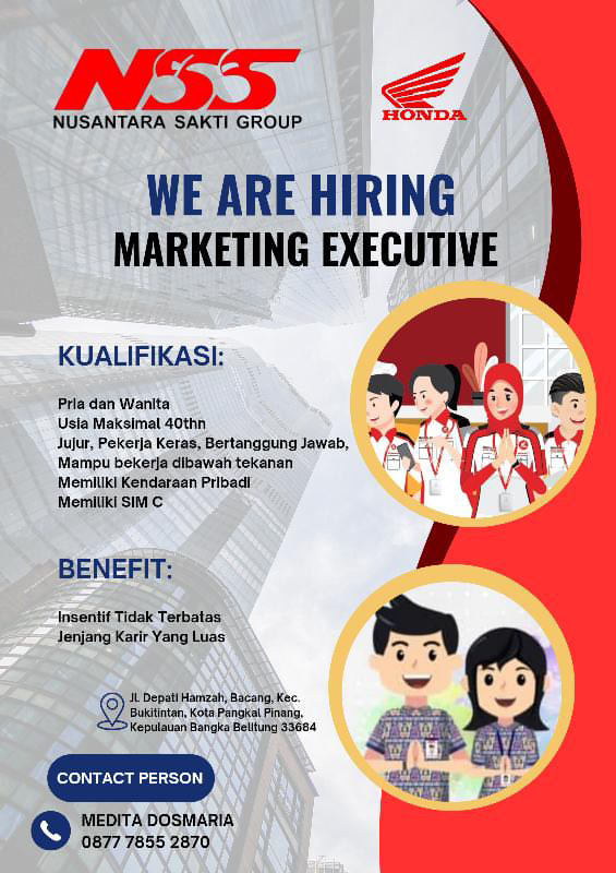 Nusantara sakti Group/NSS Pangkalpinang- perusahaan bergerak dibidang dealer kendaraan,bengkel resmi & pembiayaan multiguna membuka kesempatan kerja untuk posisi MARKETING EXECUTIVE kendaraan.