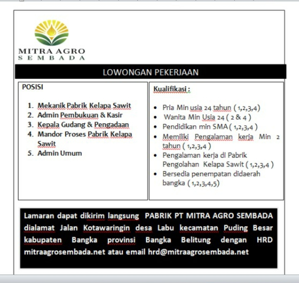 Mekanik pabrik,Admin Pembukuan-Kasir,Kepala Gudang-Pengadaan,Mandor Proses Pabrik & Admin Umum-PT.Mitra Agro Sembada-Bangka Belitung