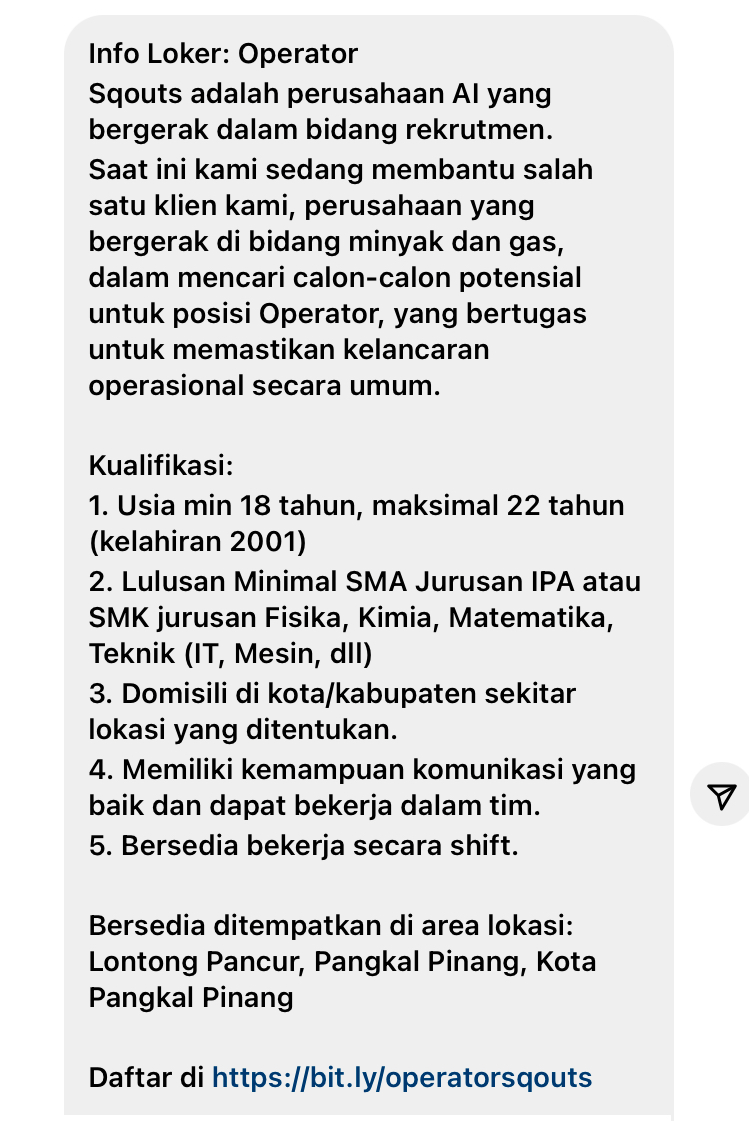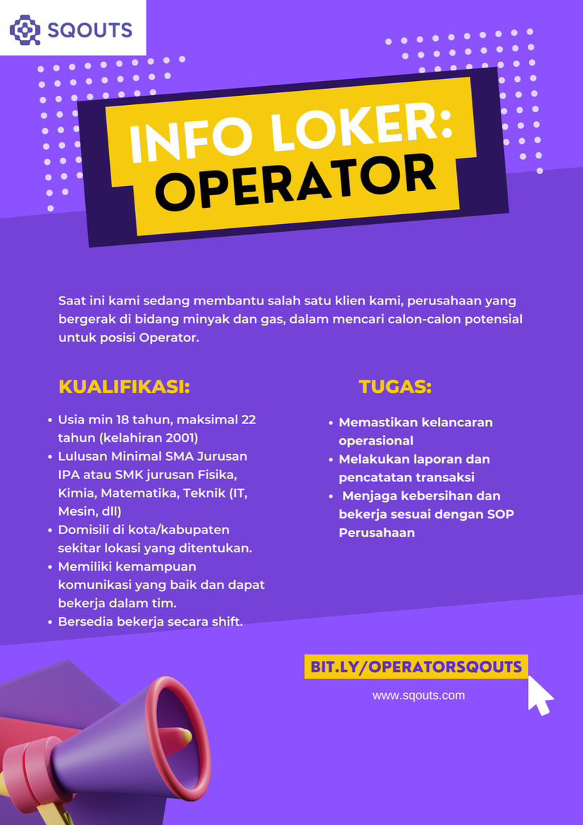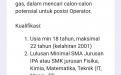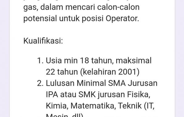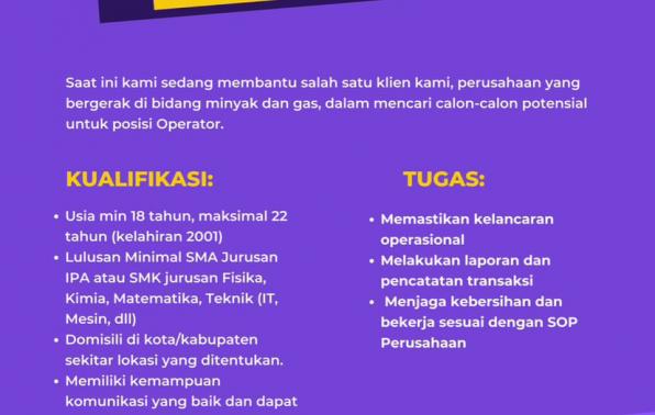 Diperlukan Operator Minyak dan Gas berlokasi di area Lontong Pancur-Pangkalpinang.