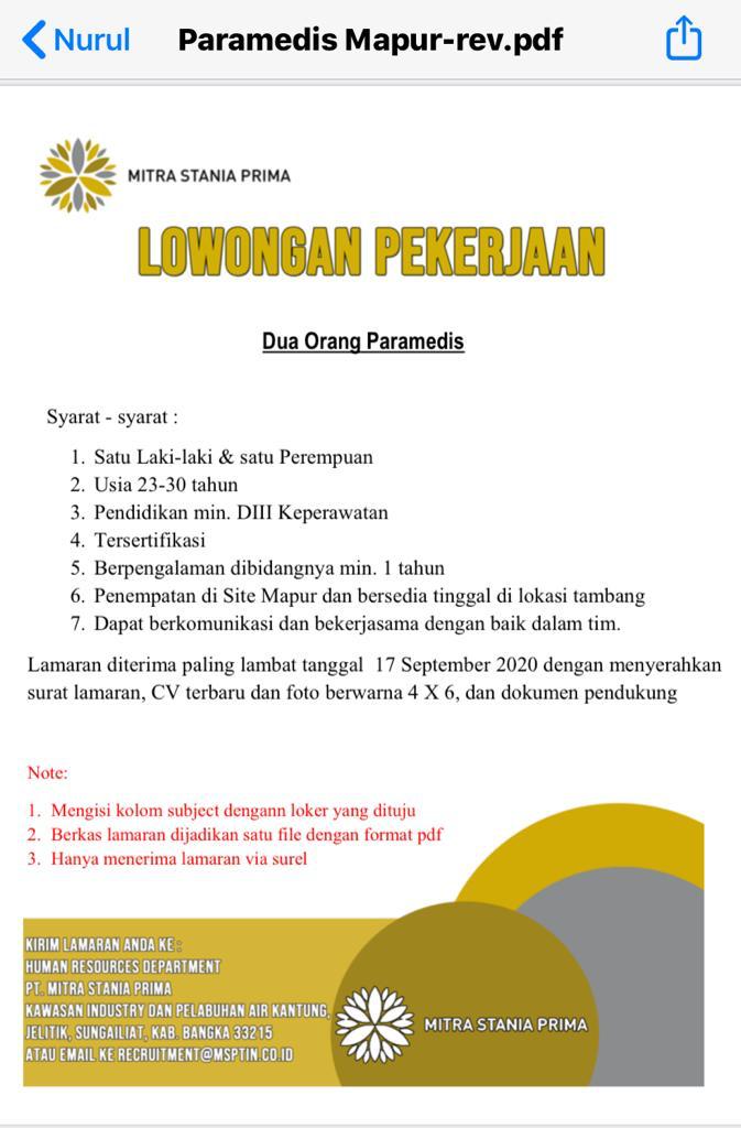 Syarat : satu Laki-Laki & satu personil Perempuan, usia 23-30 tahun,pendidikan minimal D.III Keperawatan,Tersertifikasi,berpengalaman di bidangnya minimal 1(satu)tahun,penempatan di Site Mapur dan bersdia tinggal di lokasi tambang.