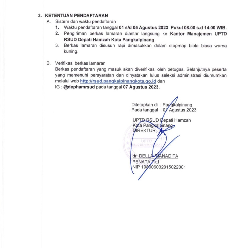 Pengiriman berkas Lamaran diantar langsung ke Kantor Manajemen UPTD RSUD Depati Hamzah Kota Pangkalpinang
