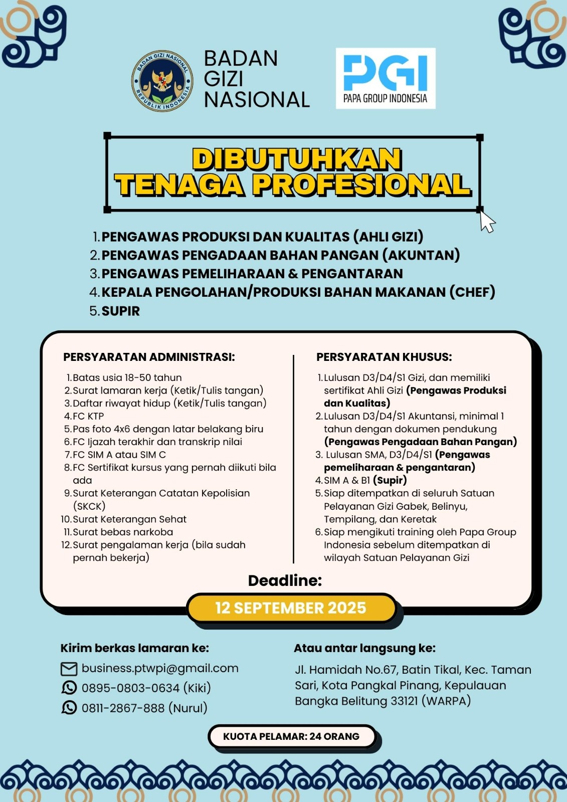 Deadline 12 September 2025 dengan kuota pelamar 25 Orang.wilayah Bangka Belitung