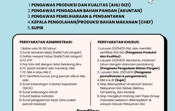 PAPA GROUP INDONESIA(WARPA)-Pengawasan BADAN GIZI NASIONAL membuka kesempatan kerja untuk posisi: