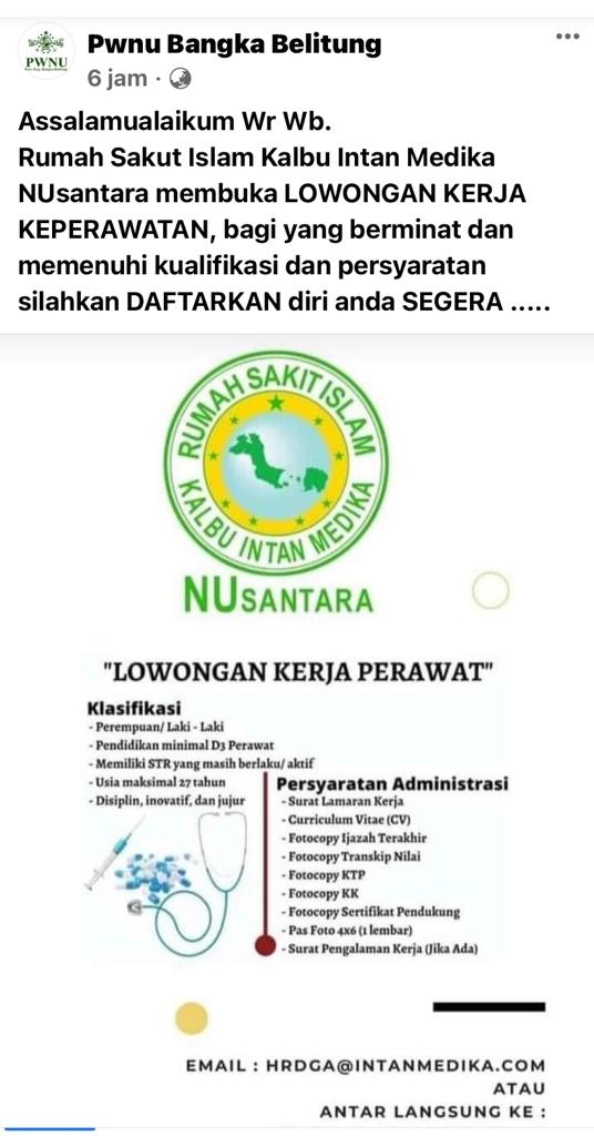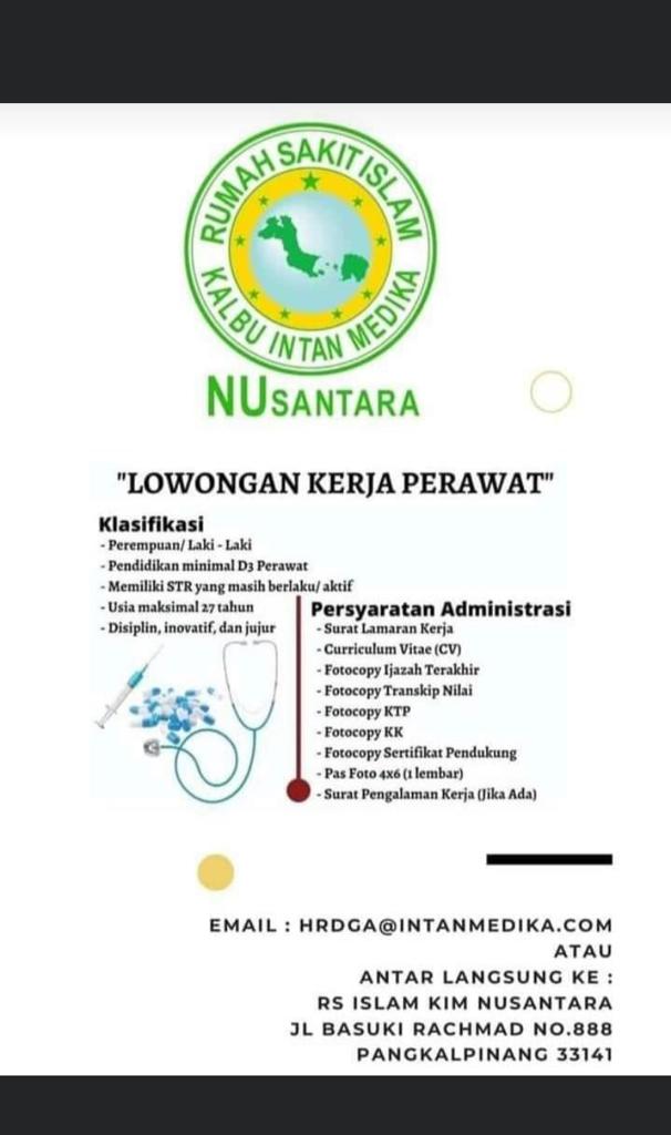 Rumah Sakit Islam-KALBU INTAN MEDIKA NUsantara membuka kesempatan kerja untuk posisi Perawat-Rumah Sakit Islam-KIM @Pangkalpinang