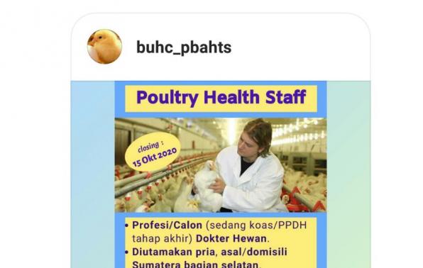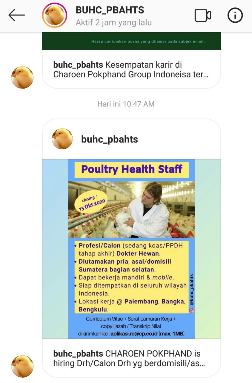 CHAROEN POKPHAND membutuhkan Drh/Calon Drh yg berdomisili/asal Sumbagsel untuk mengisi posisi POULTRY HEALTH STAFF.