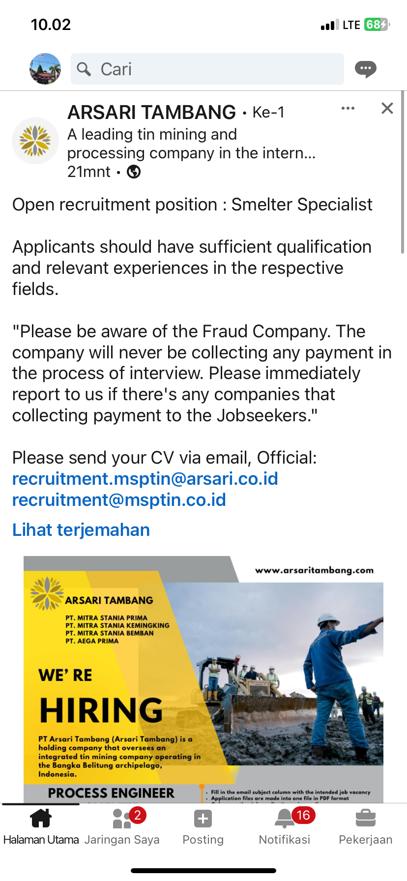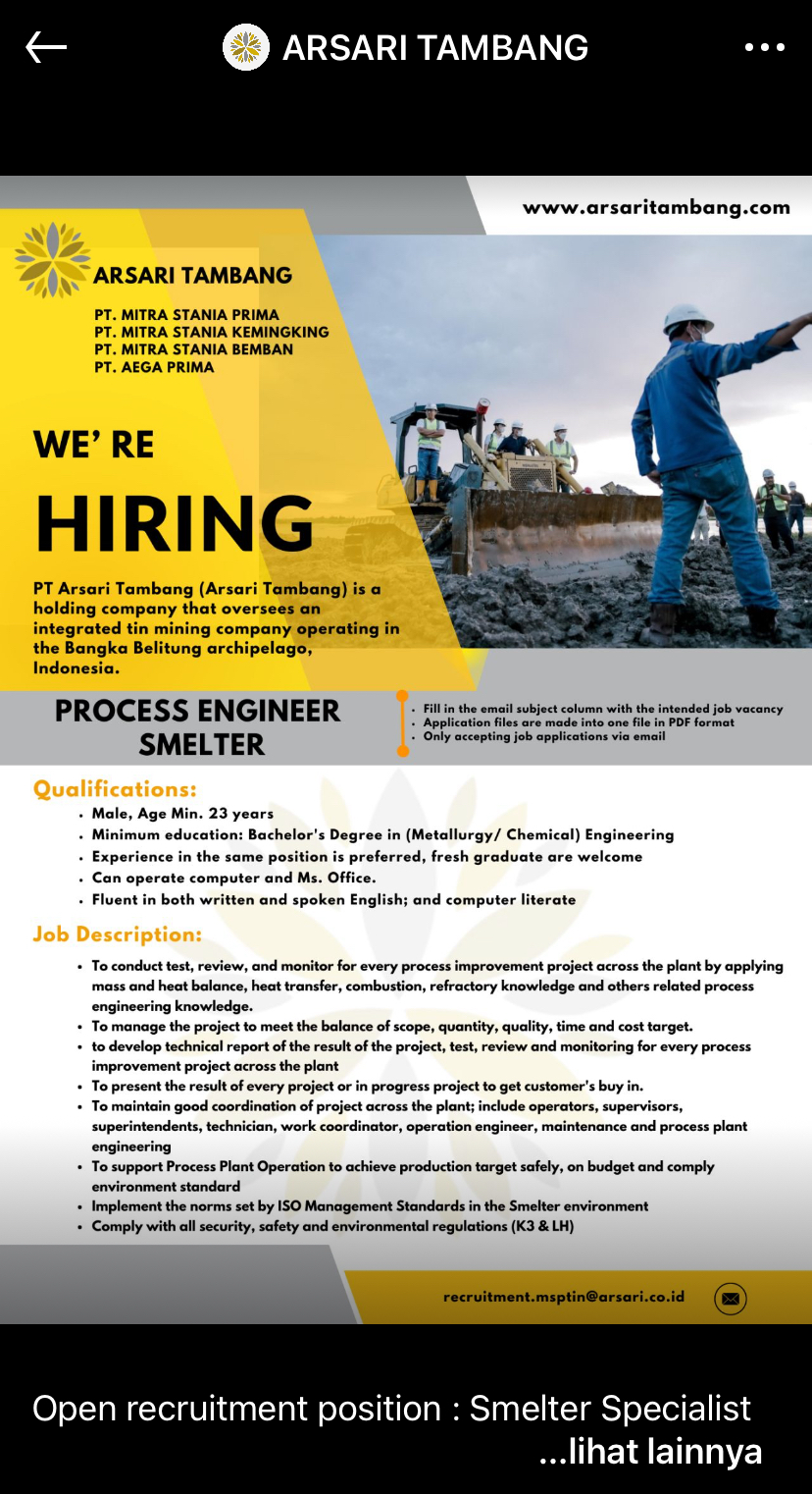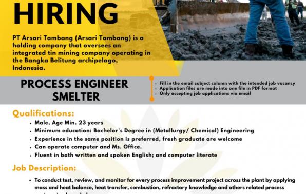 Arsari Tambang Group Bangka membuka kesempatan kerja untuk posisi Process engineer Smelter penempatan Bangka Belitung