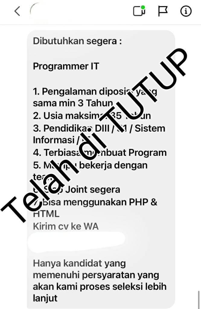 (Info Loker bagian iT telah di TUTUP atas permintaan HRD Perusahaan terhitung 12.00 wib pada hari ini, karena telah banyak pelamar )