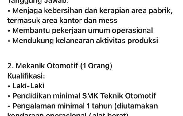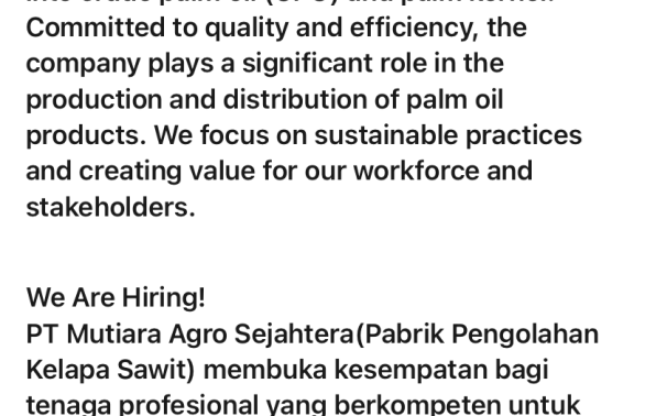 PT MUTIARA AGRO SEJAHTERA membuka kesempatan kerja untuk posisi: