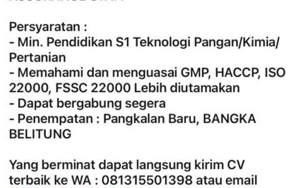 info Loker QUALITY CONTROL/QUALITY ASSURANCE STAFF-CV Panen Baru-PangkalanBaru-Bangka Belitung
