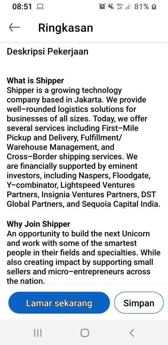 pendaftaran di link ; https://jobs.jobvite.com/shipper/job/ozdRffwC & atau di : https://www.linkedin.com/jobs/view/2593314506/