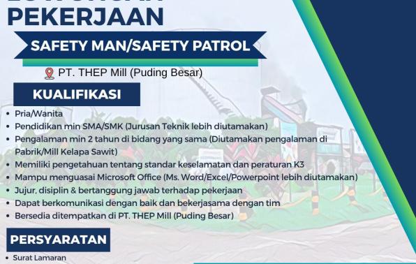 PT THEP membuka kesempatan kerja untuk posisi Safety Man/Safety Patrol berloklasi di Puding Besar.