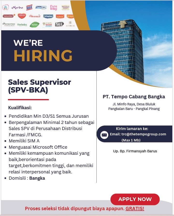 info Loker Sales Supervisor-PT TEMPO CABANG Bangka