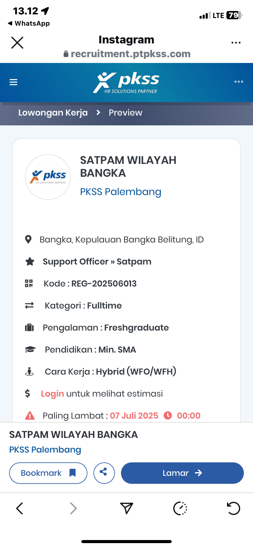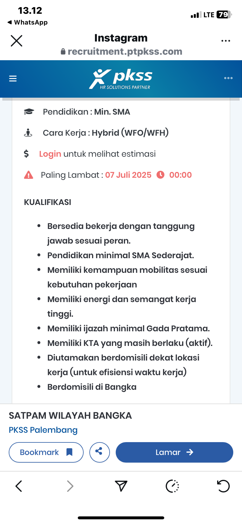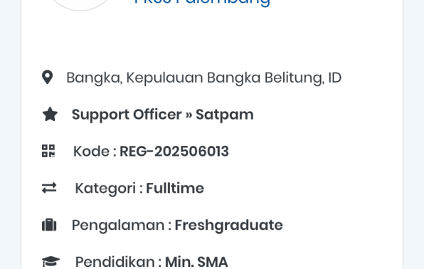 Liknk Pendaftaran: https://recruitment.ptpkss.com/id/co/pkss-palembang/reg-202506013-satpam-wilayah-bangka