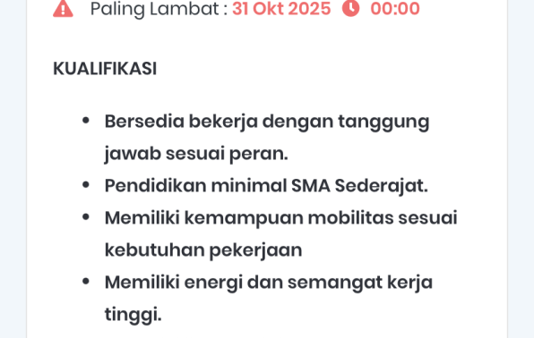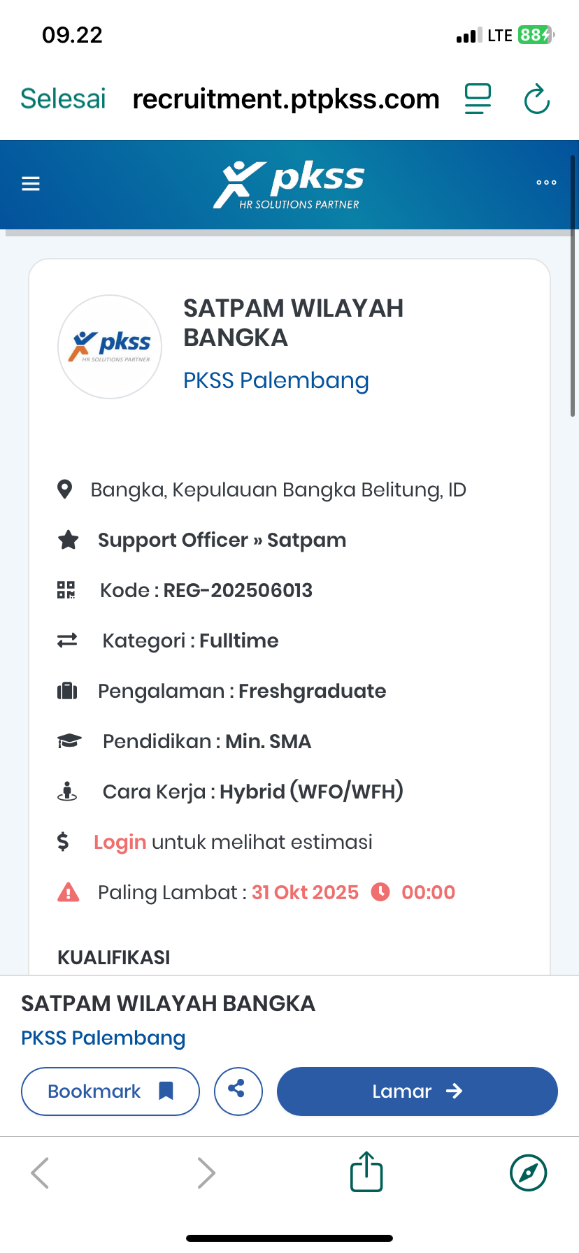 Pendaftaran di Link: https://recruitment.ptpkss.com/id/co/pkss-palembang/reg-202506013-satpam-wilayah-bangka