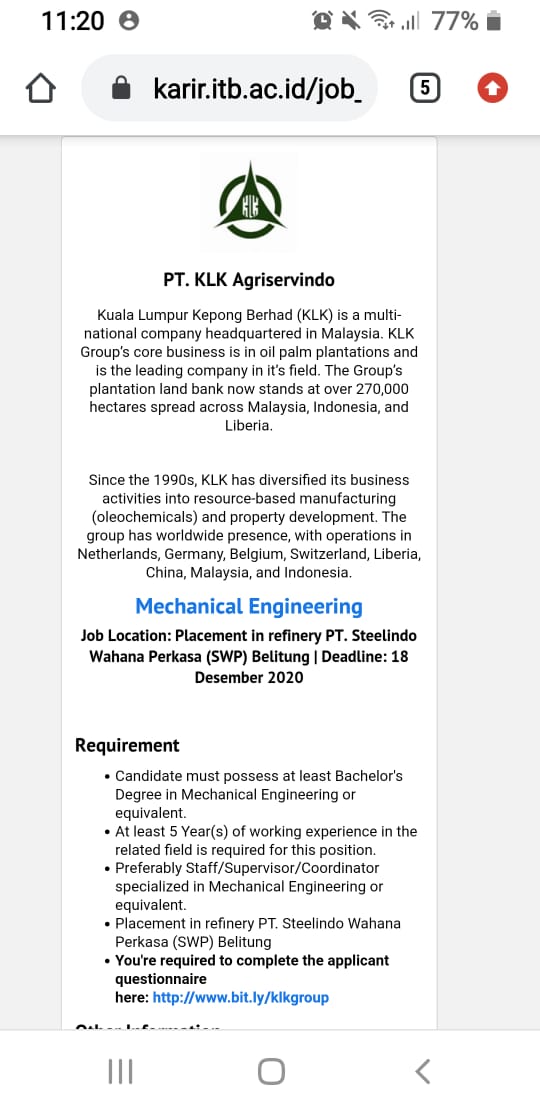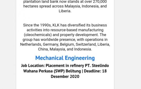 PT. KLK Agriservindo Membuka kesempatan kerja untuk penempatan/posisi sebagai Mechanical Engineering-Refinery @PT.SteeLindo Wahana Perkasa-Belitung