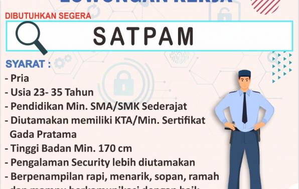 Syarat: pria, usia 23-35 tahun, pendidikan minimal SMA/SMK/sederajad, diutamakan memiliki KTA/minimal sertifikat Gada Pratama, tinggi badan minimal 170 cm, pengalaman security lebih diutamakan, berpenampilan rapi-menarik-sopan-ramah dan mampu berkomunikasi dengan baik.