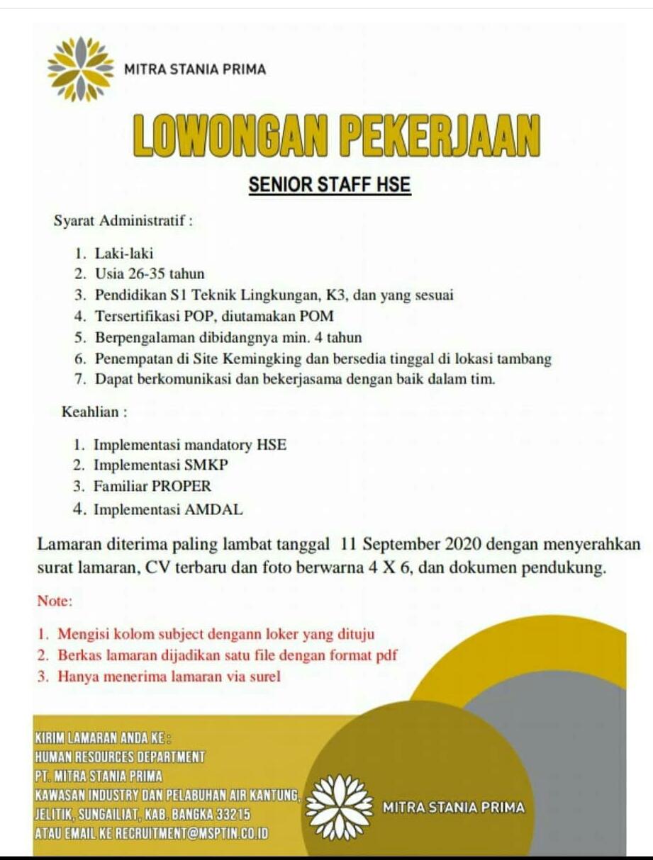 Membuka kesempatan kerja dalam posisi SENIOR STAFF HSE