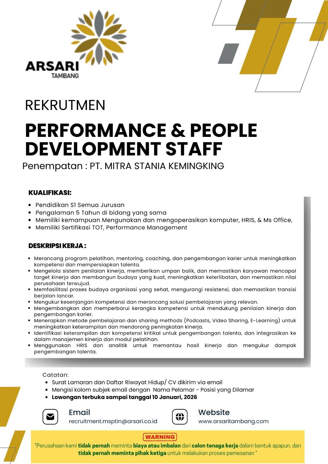 2. Performance & People Development Staff, Batas pengiriman berkas Lamaran 10 Januari 2025.