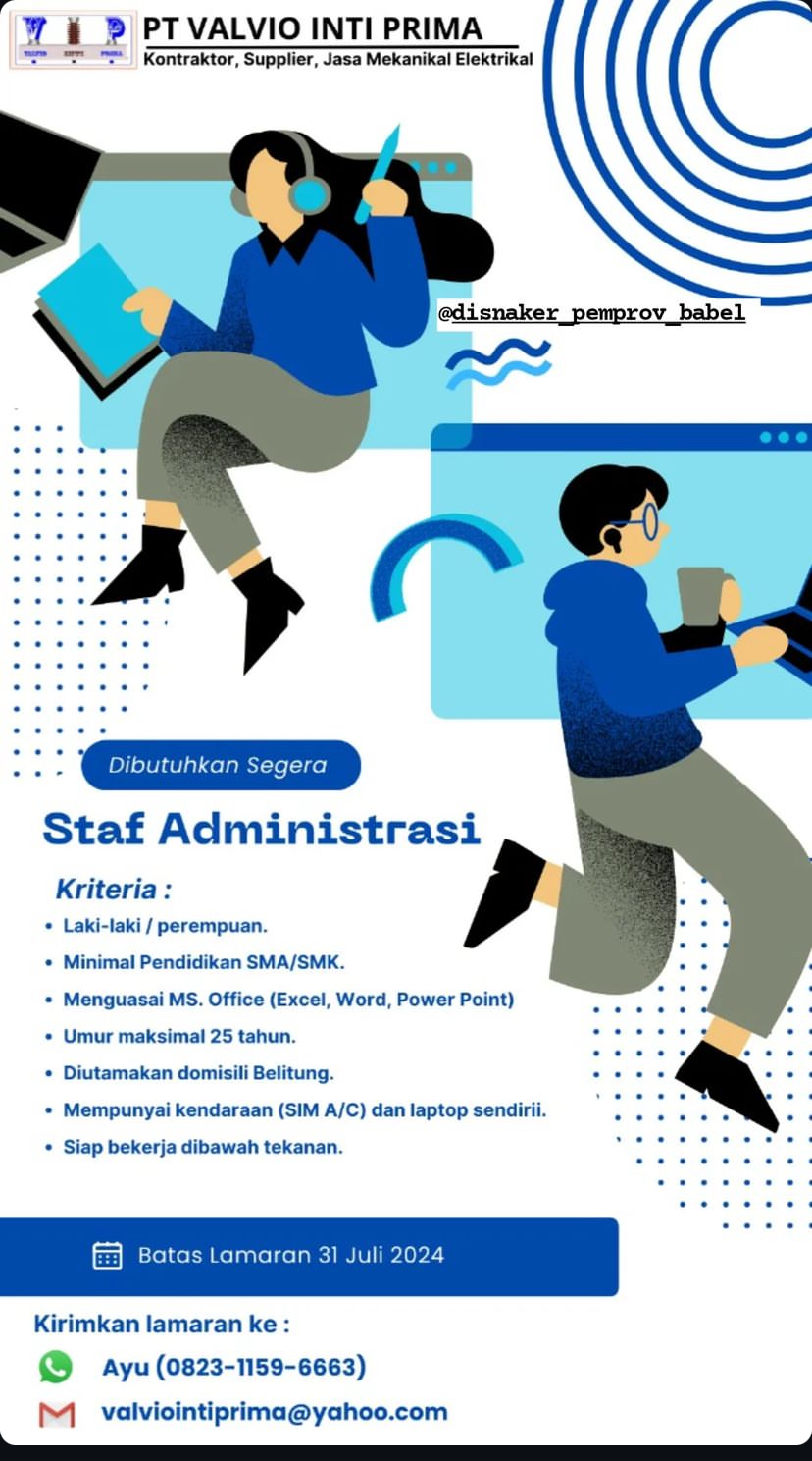 PT Valvio Inti Prima bergerak di bidang Kontraktor,suplier & Mekanikal Elektrikal membuka kesempatan kerja untuk posisi STAF ADMINISTRASI