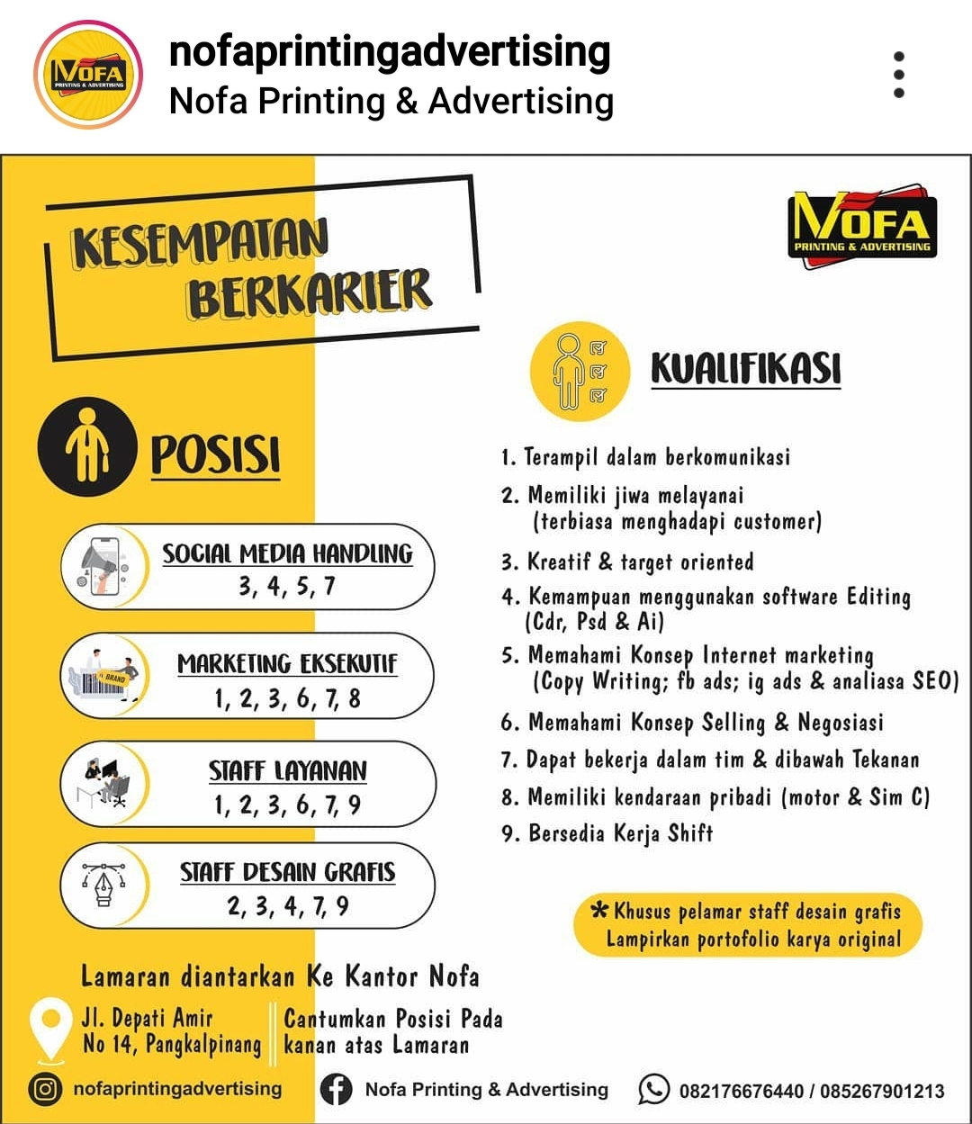 Staf Layanan,Staf Desain Grafis,Marketing & social media Handling @nofaprintingadvertising-Pangkalpinang