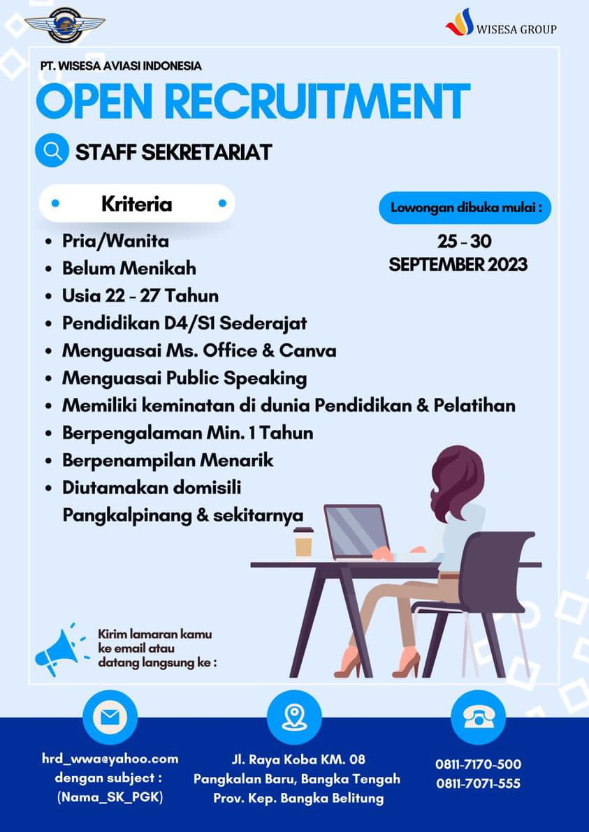 info Loker Staf Sekretariat-PT Wisesa Aviasi Indonesia-Penempatan Pangkalpinang