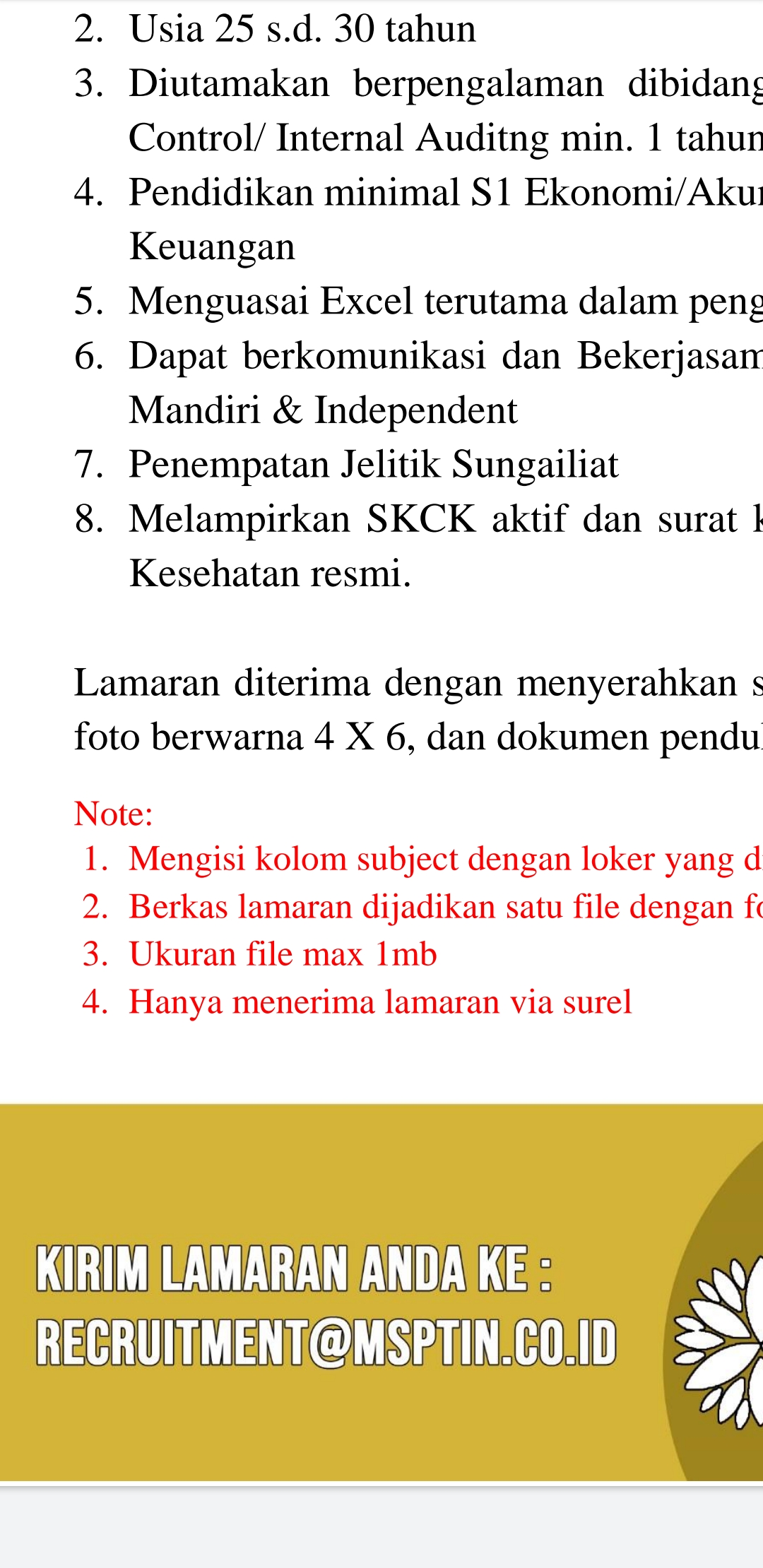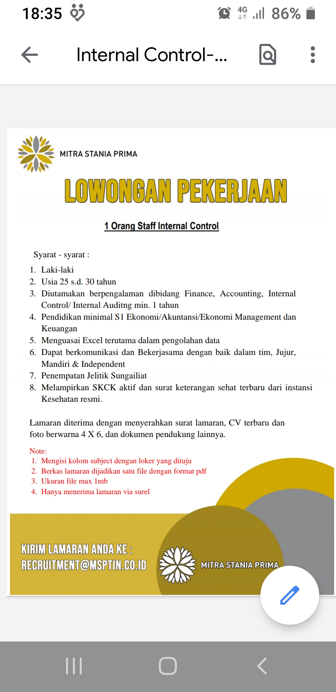 staff internal Control @Mitra Stania Prima-Bangka